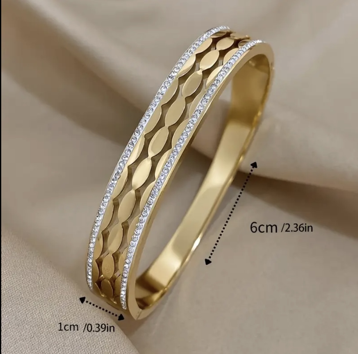 Gold Plated Anti Tarnish Stainless Steel bangle crafted with a luxurious textured center design, framed by sparkling crystal-studded edges for a refined and elegant finish. Made from high-quality stainless steel, this bangle offers long-lasting shine, excellent durability, and resistance to tarnishing or fading. The structured silhouette provides a comfortable fit while delivering a bold yet sophisticated statement. Perfect for special occasions or elevated everyday wear, this bangle adds timeless charm to any jewelry collection.