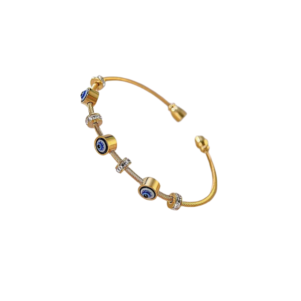 Gold Plated Stainless Steel Anti Tarnish bracelet designed with delicate evil eye charms that symbolize protection and positive energy. Crafted from premium stainless steel, this bracelet features a polished gold finish with detailed accents for a luxurious look. The open cuff design ensures a comfortable and adjustable fit, while the lightweight structure makes it ideal for everyday wear. Stylish yet meaningful, this bracelet effortlessly complements both casual and elegant outfits, making it a perfect addition to any jewelry collection.